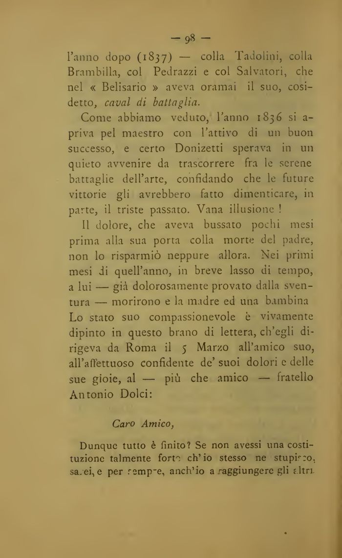 Il dolore, che aveva bussato pochi mesi prima alla sua porta colla morte del padre, non lo risparmiò neppure allora. Nei primi mesi di quell'anno, in breve lasso di tempo, a lui — già dolorosamente provato dalla sventura — morirono e la madre ed una bambina Lo stato suo compassionevole è vivamente dipinto in questo brano di lettera, ch'egli dirigeva da Roma il 5 Marzo all'amico suo, all'affettuoso confidente de' suoi dolori e delle sue gioie, al — più che amico — fratello Antonio Dolci: