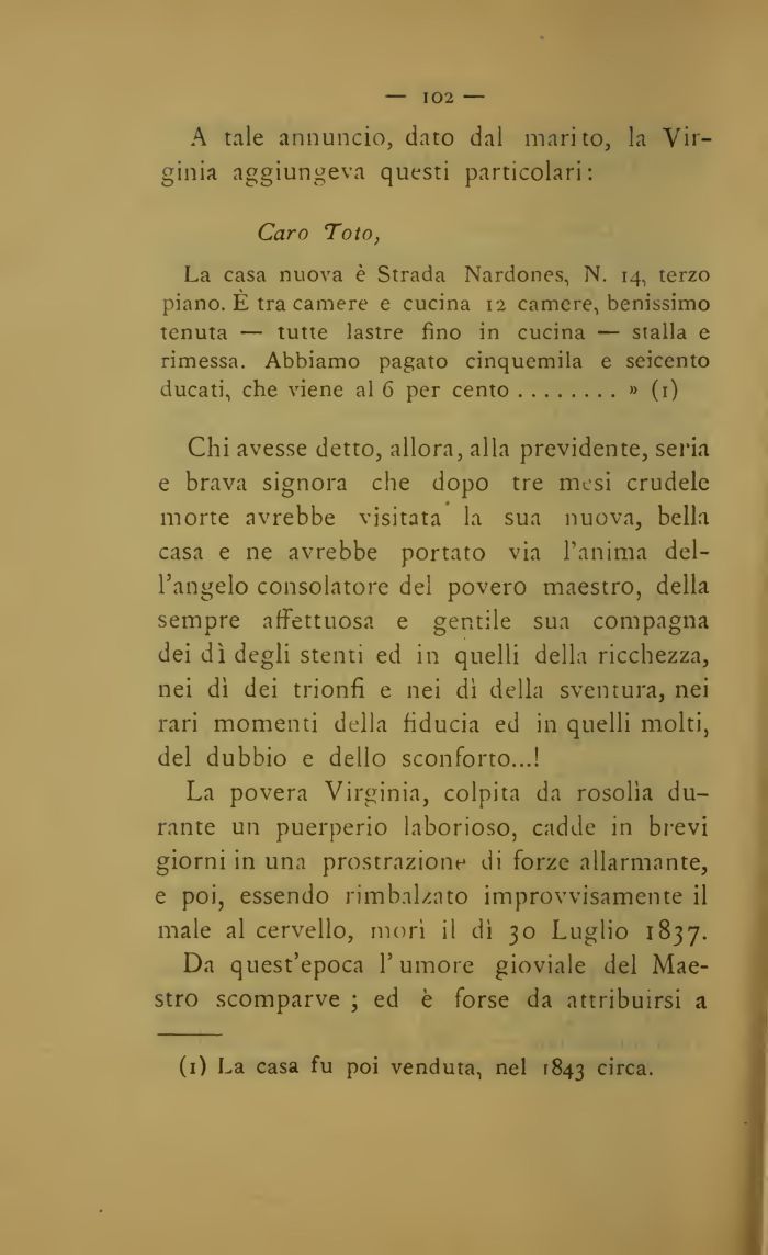 La casa nuova è Strada Nardones, N. 14, terzo piano. E tra camere e cucina 12 camere, benissimo tenuta — tutte lastre fino in cucina — stalla e rimessa. Abbiamo pagato cinquemila e seicento ducati, che viene al 6 per cento........» (1)