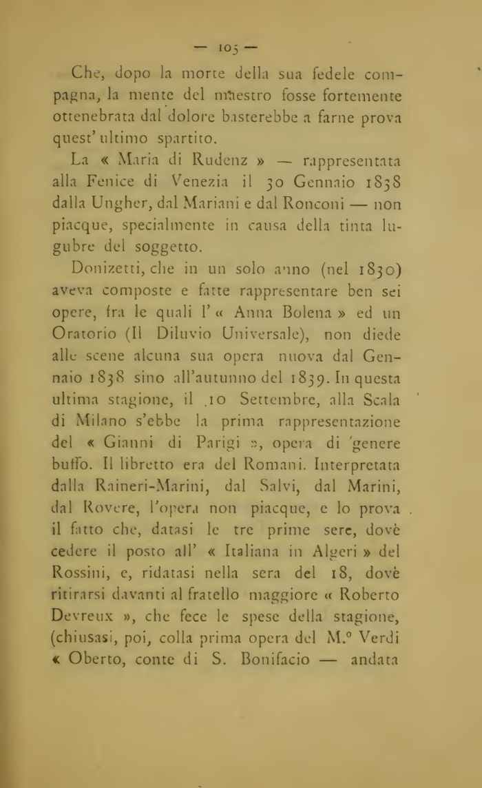 Donizetti, che in un solo anno (nel 1830) aveva composte e fatte rappresentare ben sei opere, fra le quali 1' « Anna Bolena » ed un Oratorio (Il Diluvio Universale), non diede alle scene alcuna sua opera nuova dal Gennaio 1838 sino all'autunno del 1839. In questa ultima stagione, il .10 Settembre, alla Scala di Milano s'ebbe la prima rappresentazione del « Gianni di Parigi opera di 'genere buffo. Il libretto era del Romani. Interpretata dalla Raineri-Marini, dal Salvi, dal Marini, dal Rovere, l'opera non piacque, e lo prova il fatto che, datasi le tre prime sere, dovè cedere il posto all' « Italiana in Algeri » del Rossini, e, ridatasi nella sera del 18, dovè ritirarsi davanti al fratello maggiore « Roberto Devreux », che fece le spese della stagione, (chiusasi, poi, colla prima opera del M.° Verdi «c Oberto, conte di S. Bonifacio — andata