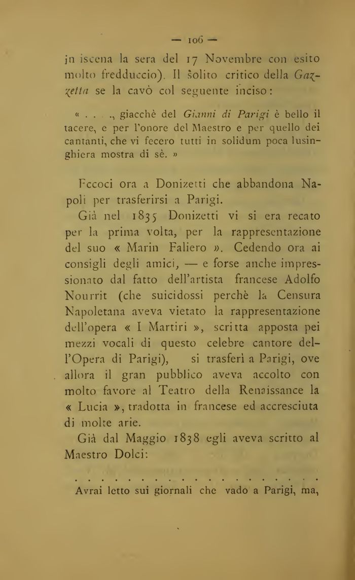 Già nel 1835 Donizetti vi si era recato per la prima volta, per la rappresentazione del suo « Marin Faliero ». Cedendo ora ai consigli degli amici, — e forse anche impressionato dal fatto dell'artista francese Adolfo Nourrit (che suicidossi perchè la Censura Napoletana aveva vietato la rappresentazione dell'opera « I Martiri », scritta apposta pei mezzi vocali di questo celebre cantore dell'Opera di Parigi), si trasferì a Parigi, ove allora il gran pubblico aveva accolto con molto favore al Teatro della Renaissance la « Lucia », tradotta in francese ed accresciuta di molte arie.