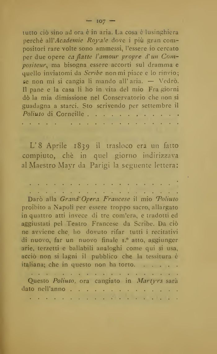 Darò alla Grand'Opera Francese il mio 'Poliuto proibito a Napoli per essere troppo sacro, allargato in quattro atti invece di tre com'era, e tradotti ed aggiustati pel Teatro Francese da Scribe. Da ciò ne avviene clic ho dovuto rifar tutti i recitativi di nuovo, far un nuovo finale i.° atto, aggiunger arie, terzetti e ballabili analoghi come qui si usa, acciò non si lagni il pubblico che la tessitura è italiana; che in questo non ha torto......