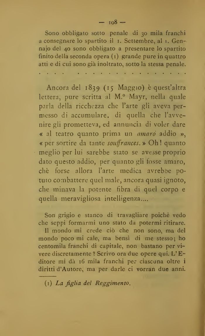 Ancora del 1839 (15 Maggio) è quest'altra lettera, pure scritta al M.° Mayr, nella quale parla della ricchezza che l'arte gli aveva permesso di accumulare, di quella che l'avvenire gli prometteva, ed annuncia di voler dare « al teatro quanto prima un amaro addio », « per sortire da tante souffrances. » Oh ! quanto meglio per lui sarebbe stato se avesse proprio dato questo addio, per quanto gli fosse amaro, eh è forse allora l'arte medica avrebbe potuto combattere quel male, ancora quasi ignoto, che minava la potente fibra di quel corpo e quella meravigliosa intelligenza....