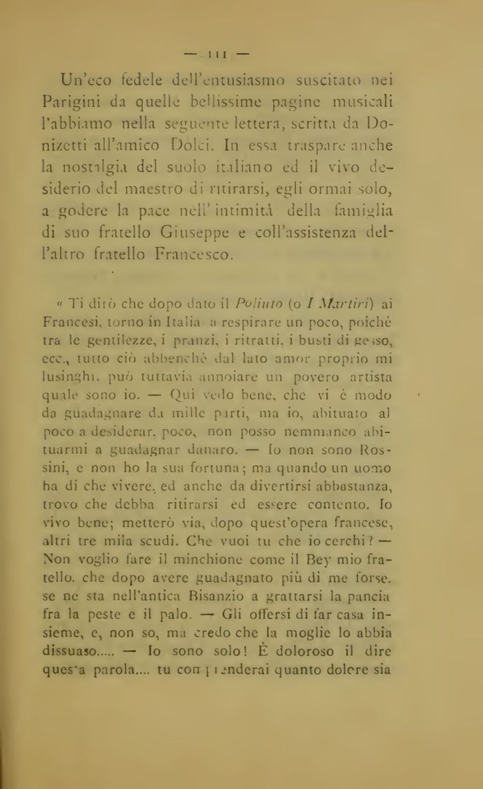 Un'eco fedele dell'entusiasmo suscitato nei Parigini da quelle bellissime pagine musicali l'abbiamo nella seguente lettera, scritta da Donizetti all'amico Dolci. In essa traspare anche la nostalgia del suolo italiano ed il vivo de-siderio del maestro di ritirarsi, egli ormai solo, a godere la pace nell' intimità della famiglia di suo fratello Giuseppe e coll'assistenza dell'altro fratello Francesco.