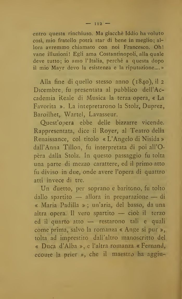 Un duetto, per soprano e baritono, fu tolto dallo spartito — allora in preparazione — di « Maria Padilla » ; un'aria, del basso, da una altra opera. Il vero spartito — cioè il terzo ed il quarto atto — restarono tali e quali come prima, salvo la romanza « Ange si pur », tolta ad imprestito dall'altro manoscritto del « Duca d'Alba », e l'altra romanza « Fernand, ecoute la prier », che il maestro ha aggiu-