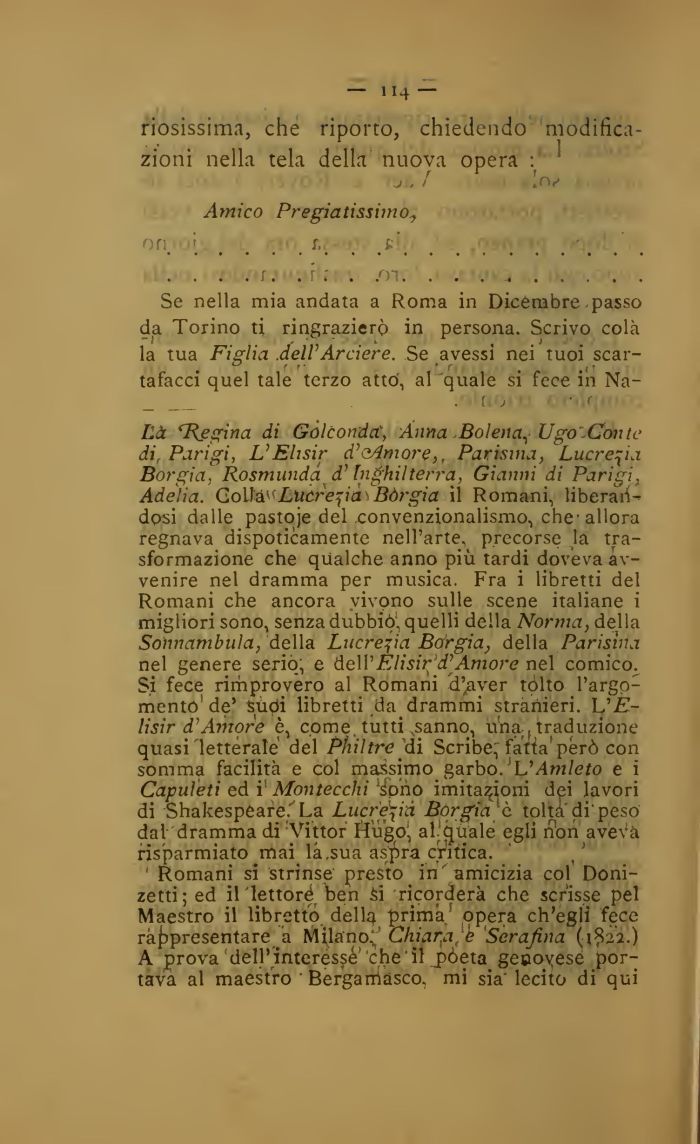 Là Regina di GÒlconda\ Anna Bolena, Ugo'.Conte di, Parigi, L'Elisir d'amore,, Parisma, Lucrezia Borgia, Rosmunda d'Inghilterra, Gianni di Parigi, Adelia. Gollà.^Lucrezia' Bòrgia il Romani, liberandosi dalle pastoje del convenzionalismo, che'allora regnava dispoticamente nell'arte, precorse la trasformazione che qualche anno più tardi doveva avvenire nel dramma per musica. Fra i libretti del Romani che ancora vivono sulle scene italiane i migliori sono, senza dubbiò, quelli della Nonna, della Sonnambula, della Lucrezia Borgia; della Parisìna nel genere serio; e dell'Elisir 'd'Amore nel comico. Si fece rimprovero al Romani d'/iver tòlto l'argomento de' sùdi libretti da drammi stranieri. \JE-lisir d'Amore è, come, tutti ^sanno, una , traduzione quasi letterale del Philtre di Scribe; fatta' però con somma facilità e col massimo garbo. 'L'Amleto e i Caputeti ed i' Montecchi 'ip'no imitazioni dei lavori di Shakespeare.''La Lucrezia Borgia è tolta di'peso dal dramma di Vittor tìugo^ al quale egli non ave\'à risparmiato mai là .sua as^ra critica. ' Romani si strinse' presto in amicizia col Donizetti; ed il'lettore ben Si ricorderà che scrisse pel Maestro il libretto della prima opera ch'egli fece rappresentare a Milano^ Chiariae Serafina (i?22.) A prova dell'interesse'che il jòeta geooyese portava al maestro ' Bergamasco, mi sia lecito di qui