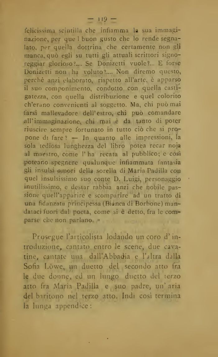 -infelicissima scintilla che infiamma la sua immaginazione, per que 1 buon gusto che lo rende segnalato, per quella dottrina che certamente non gli manca, quo egli su tutti gli attuali scrittori signoreggiar glorioso?.... Se Donizetti vuole?... E forse Donizetti non ha voluto?.... Non diremo questo, perchè anzi elaborato, rispetto all'arte, è apparso il suo componimento, condotto con quella castigatezza, con quella distribuzione e quel colorito ch'erano convenienti al soggetto. Ma, chi può mai farsi mallevadore dell'estro, chi può comandare all'immaginazione, chi mai è da tanto di poter riuscire sempre fortunato in tutto ciò che si propone di fare? — In quanto alle impressioni, la sola tediosa lunghezza del libro potea recar noja al maestro, come l'ha recata al pubblico; e così poteano spegnere qualunque infiammata fantasia gli insulsi -amori della sorella di Maria Padilla con quel insulsissimo suo conte D. Luigi, personaggio inutilissimo, e destar rabbia anzi che nobile passione quell'apparire e scomparire ad un tratto di una fidanzata principessa (Bianca di Borbone) mandataci fuori dal poeta, come si è detto, fra le comparse che non parlano. » ![]() |