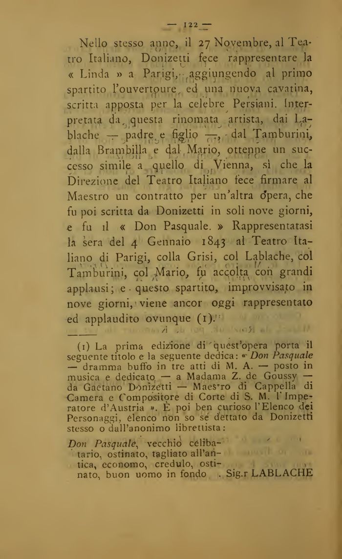 (1) La prima edizione di quest'opera porta il seguente titolo e la seguente dedica: « Don Pasquale — dramma buffo in tre atti di M. A. — posto in musica e dedicato. — a Madama Z. de Goussy — da Gaetano Donizetti — Maestro di Cappella di Camera e Compositore di Corte di S. M. l'Imperatore d'Austria ». E poi ben curioso l'Elenco dei Personaggi, elenco non so sé dettato da Donizetti stesso o dall'anonimo librettista: