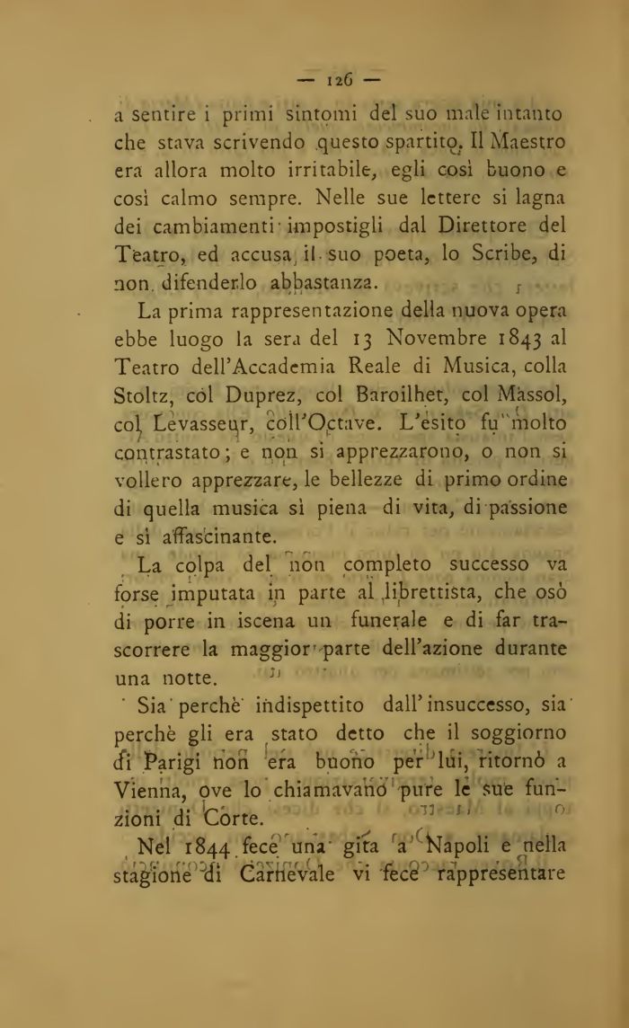a sentire i primi sintomi del suo male intanto che stava scrivendo questo spartito. Il Maestro era allora molto irritabile, egli così buono e così calmo sempre. Nelle sue lettere si lagna dei cambiamenti-impostigli dal Direttore del Teatro, ed accusa, il-suo poeta, lo Scribe, di non. difenderlo abbastanza. ; .
