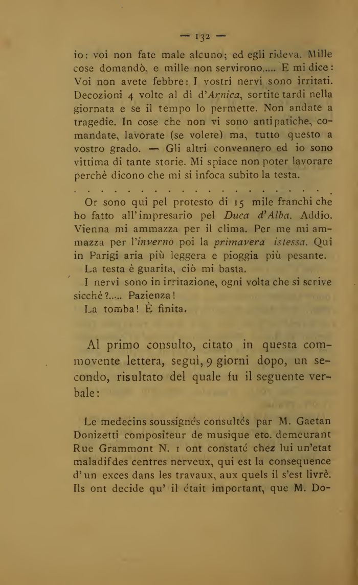 Le medecins soussignés consultes par M. Gaetan Donizetti compositeur de musique eto. demeurant Rue Grammont N. 1 ont constate chez lui un'etat maladifdes centres nerveux, qui est la consequence d'un exces dans les travaux, aux quels il s'est livrè. Ils ont decide qu' il ctait important, que M. Do-