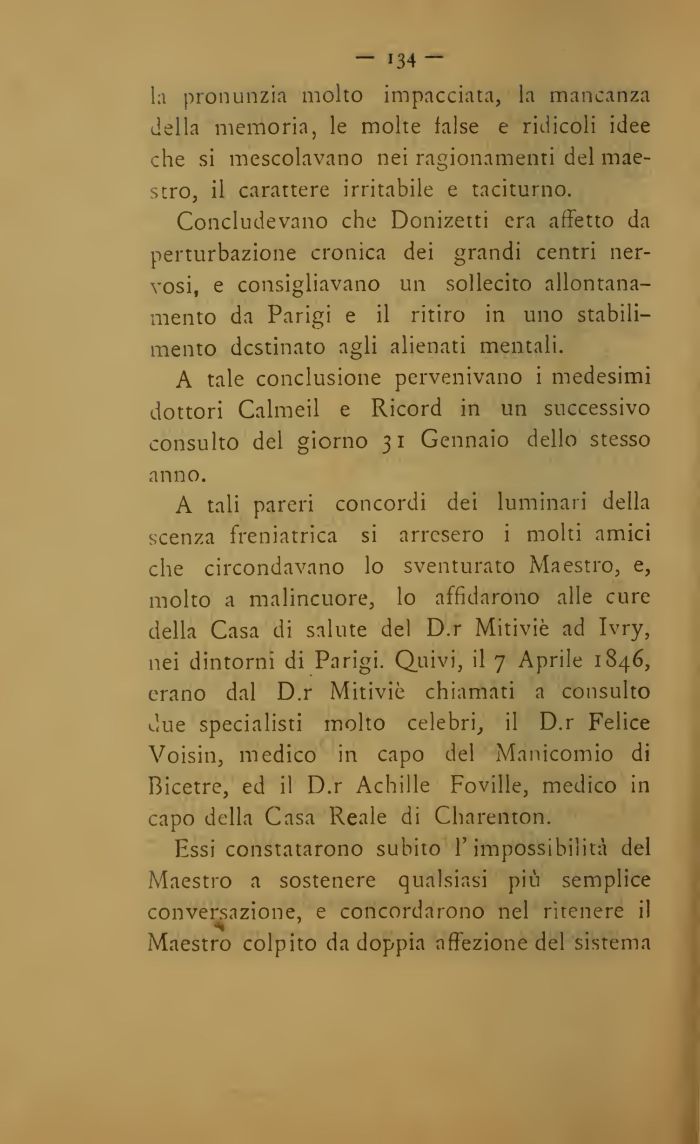 A tali pareri concordi dei luminari della scenza freniatrica si arresero i molti amici che circondavano lo sventurato Maestro, e, molto a malincuore, lo affidarono alle cure della Casa di salute del D.r Mitivič ad Ivry, nei dintorni di Parigi. Quivi, il 7 Aprile 1846, erano dal D.r Mitivič chiamati a consulto due specialisti molto celebri, il D.r Felice Voisin, medico in capo del Manicomio di Bicetre, ed il D.r Achille Foville, medico in capo della Casa Reale di Charenton.