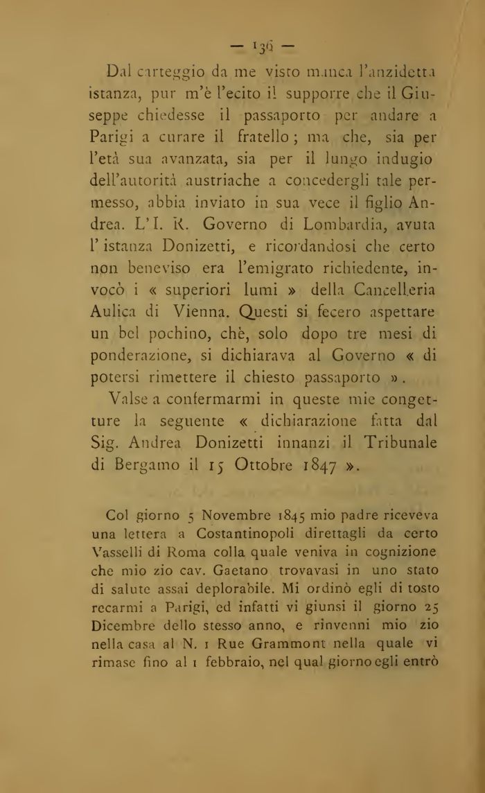 Dal carteggio da me visto manca l'anzidetta istanza, pur m'è l'ecito il supporre che il Giuseppe chiedesse il passaporto per andare a Parigi a curare il fratello ; ma che, sia per l'età sua avanzata, sia per il lungo indugio dell'autorità austriache a concedergli tale permesso, abbia inviato in sua vece il figlio Andrea. L'I. R. Governo di Lombardia, avuta l'istanza Donizetti, e ricordandosi che certo non beneviso era l'emigrato richiedente, invocò i « superiori lumi » della Cancelleria Aulica di Vienna. Questi si fecero aspettare un bel pochino, che, solo dopo tre mesi di ponderazione, si dichiarava al Governo « di potersi rimettere il chiesto passaporto » .