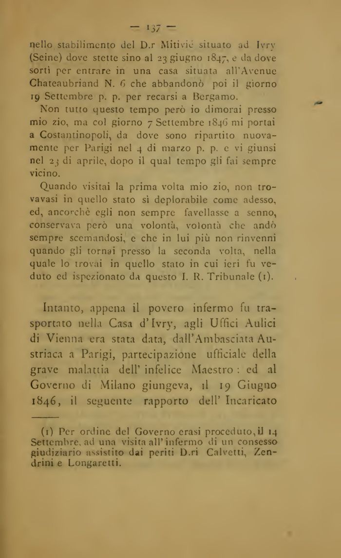 Intanto, appena il povero infermo fu trasportato nella Casa d'Ivry, agli Uffici Aulici di Vienna era stata data, dall'Ambasciata Austriaca a Parigi, partecipazione ufficiale della grave malattia dell' infelice Maestro : ed al Governo di Milano giungeva, il 19 Giugno 1846, il seguente rapporto dell' Incaricato
