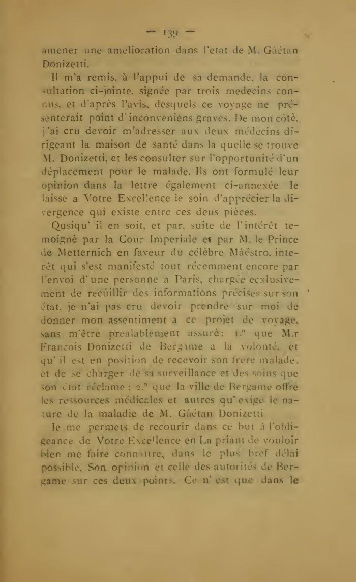 Qusiqu' il en soit, et par. suite de l'intéret te-moignè par la Cour Imperiale et par M. le Prince de Metternich en faveur du célèbre Maestro, inte-rét qui s'est manifeste tout récemment encore par fenvoi d'une personne a Paris, charge'e ecxlusive-mcnt de recuillir des informations precises sur son ' ctat, je n'ai pas cru devoir prcndre sur moi de donner mori assentiment a ce projet de voyage, sans m'ètre prealablement a.vsurè: i.n que M.r Francois Donizetti de Bergime a la volonté, et qu' il est en position de recevoir son frere malade. et de se charger de sa surveillance et des soins que ^on Ltat reclame : 2.0 que la ville de Bcrgame offre Ics rcssources mediccles et autres qu'exige le nature de la maladie de M. Gàetan Donizetti