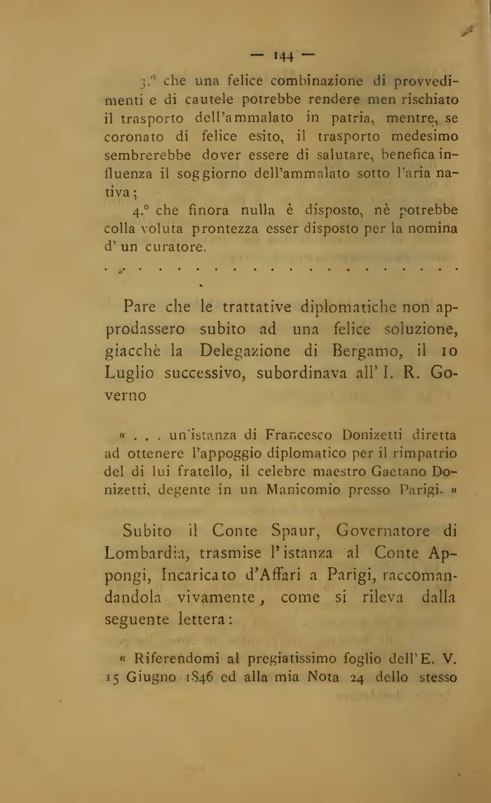 «... un'istanza di Francesco Donizetti diretta ad ottenere l'appoggio diplomatico per il rimpatrio del di lui fratello, il celebre maestro Gaetano Donizetti, degente in un Manicomio presso Parigi- »
