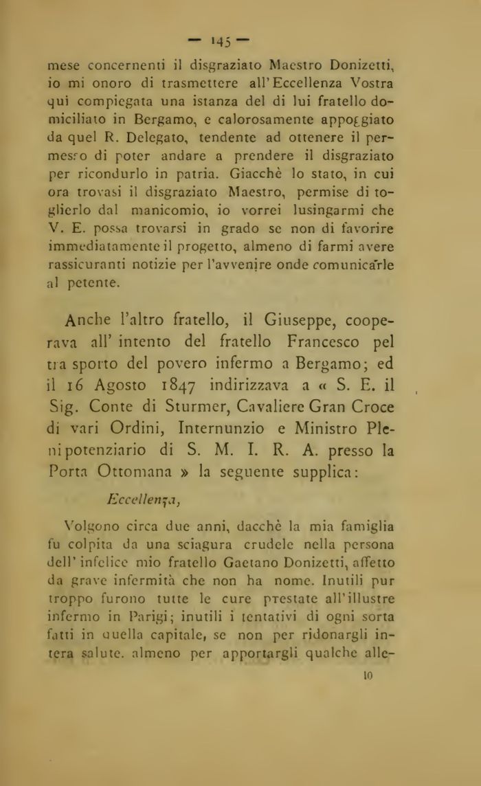 10 mi onoro di trasmettere all'Eccellenza Vostra qui compiegata una istanza del di lui fratello domiciliato in Bergamo, e calorosamente appo£giato da quel R. Delegato, tendente ad ottenere il per-mesro di poter andare a prendere il disgraziato per ricondurlo in patria. Giacché lo stato, in cui ora trovasi il disgraziato Maestro, permise di toglierlo dal manicomio, io vorrei lusingarmi che V. E. possa trovarsi in grado se non di favorire immediatamente il progetto, almeno di farmi avere rassicuranti notizie per l'avvenire onde comunica'rle al petente.