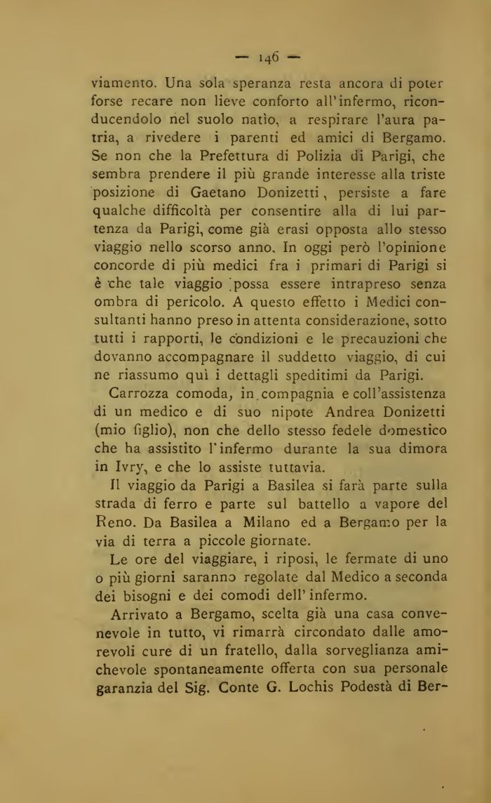 viamento. Una sola speranza resta ancora di poter forse recare non lieve conforto all'infermo, riconducendolo nel suolo natio, a respirare l'aura patria, a rivedere i parenti ed amici di Bergamo. Se non che la Prefettura di Polizia di Parigi, che sembra prendere il più grande interesse alla triste posizione di Gaetano Donizetti, persiste a fare qualche difficoltà per consentire alla di lui partenza da Parigi, come già erasi opposta allo stesso viaggio nello scorso anno. In oggi però l'opinione concorde di più medici fra i primari di Parigi si è che tale viaggio Spossa essere intrapreso senza ombra di pericolo. A questo effetto i Medici consultanti hanno preso in attenta considerazione, sotto tutti i rapporti, le condizioni e le precauzioni che dovanno accompagnare il suddetto viaggio, di cui ne riassumo qui i dettagli speditimi da Parigi.