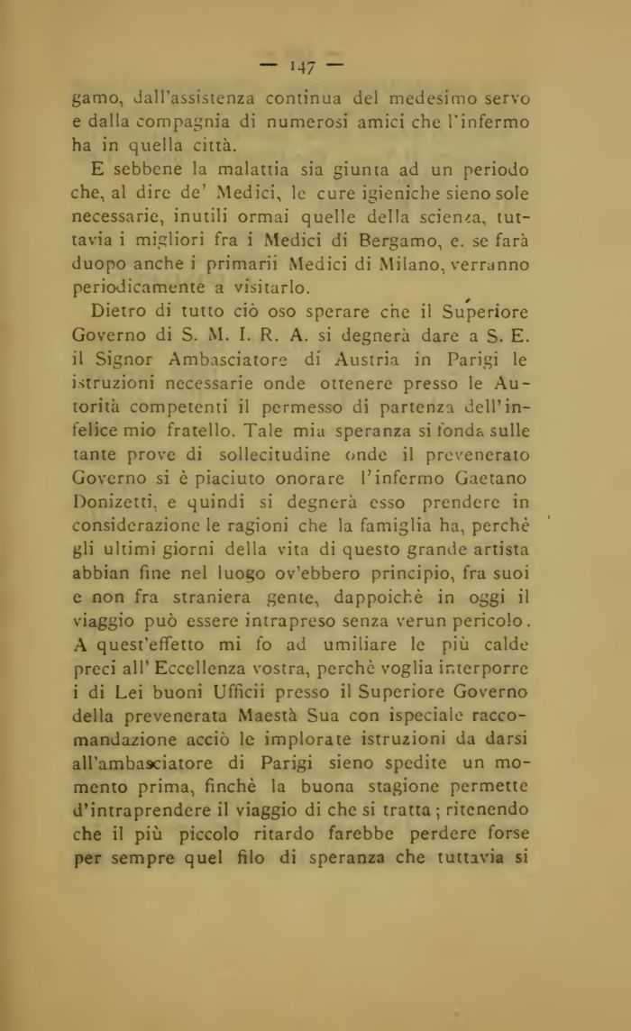 Dietro di tutto ciò oso sperare che il Superiore Governo di S. M. I. R. A. si degnerà dare a S. E. il Signor Ambasciatore di Austria in Parigi le istruzioni necessarie onde ottenere presso le Autorità competenti il permesso di partenza dell'infelice mio fratello. Tale mia speranza si fonda sulle tante prove di sollecitudine onde il prevenerato Governo si è piaciuto onorare l'infermo Gaetano Donizetti, e quindi si degnerà esso prendere in considerazione le ragioni che la famiglia ha, perchè gli ultimi giorni della vita di questo grande artista abbian fine nel luogo ov'ebbero principio, fra suoi e non fra straniera gente, dappoiché in oggi il viaggio può essere intrapreso senza verun pericolo. A quest'effetto mi fo ad umiliare le più calde preci all' Eccellenza vostra, perchè voglia interporre i di Lei buoni Ufficii presso il Superiore Governo della prevenerata Maestà Sua con ispeciale raccomandazione acciò le implorate istruzioni da darsi all'ambasciatore di Parigi sieno spedite un momento prima, finché la buona stagione permette d'intraprendere il viaggio di che si tratta ; ritenendo che il più piccolo ritardo farebbe perdere forse per sempre quel filo di speranza che tuttavia si