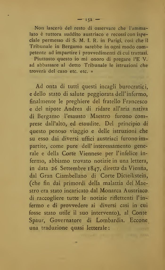 Ad onta di tutti questi incagli burocratici, e dello stato di salute peggiorata dell'infermo, finalmente le preghiere del fratello Francesco e del nipote Andrea di ridare all'aria nativa di Bergamo l'esausto Maestro furono comprese dall'alto, ed esaudite. Del principio di questo penoso viaggio e delle istruzioni che su esso dai diversi uffici austriaci furono impartite, come pure dell' interessamento generale e della Corte Viennese per l'infelice infermo, abbiamo trovato notizie in una lettera, in data 26 Settembre 1847, diretta da Vienna, dal Gran Ciambellano di Corte Dicteikstein, (che fin dai primordi della malattia del Maestro era stato incaricato dal Monarca Austriaco di raccogliere tutte le notizie riflettenti l'infermo e di provvedere ai diversi casi in cui fosse stato utile il suo intervento), al Conte Spaur, Governatore di Lombardia. Eccone una traduzione quasi letterale :