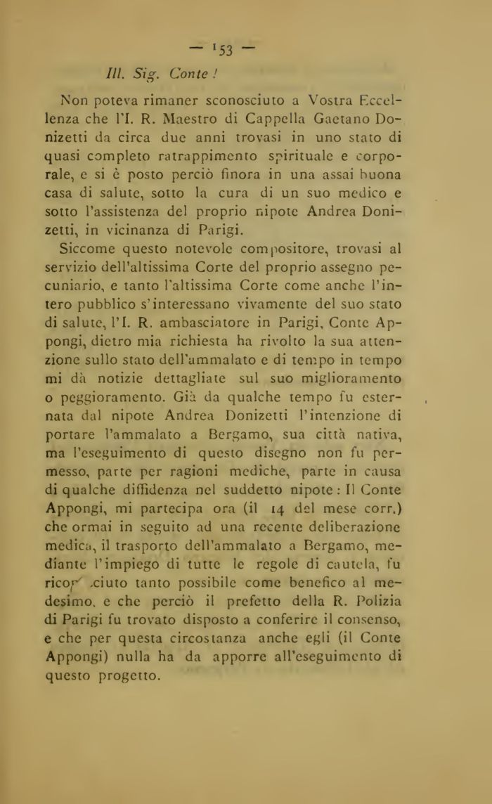 Siccome questo notevole compositore, trovasi al servizio dell'altissima Corte del proprio assegno pecuniario, e tanto l'altissima Corte come anche l'intero pubblico s'interessano vivamente del suo stato di salute, l'I. R. ambasciatore in Parigi, Conte Ap-pongi, dietro mia richiesta ha rivolto la sua attenzione sullo stato dell'ammalato e di tempo in tempo mi dà notizie dettagliate sul suo miglioramento o peggioramento. Già da qualche tempo fu esternata dal nipote Andrea Donizetti l'intenzione di portare l'ammalato a Bergamo, sua città nativa, ma l'eseguimento di questo disegno non fu permesso, parte per ragioni mediche, parte in causa di qualche diffidenza nel suddetto nipote: Il Conte Appongi, mi partecipa ora (il 14 del mese corr.) che ormai in seguito ad una recente deliberazione medica, il trasporto dell'ammalato a Bergamo, mediante l'impiego di tutte le regole di cautela, fu rico^ -ciuto tanto possibile come benefico al medesimo, e che perciò il prefetto della R. Polizia di Parigi fu trovato disposto a conferire il consenso, e che per questa circostanza anche egli (il Conte Appongi) nulla ha da apporre all'eseguimento di questo progetto.