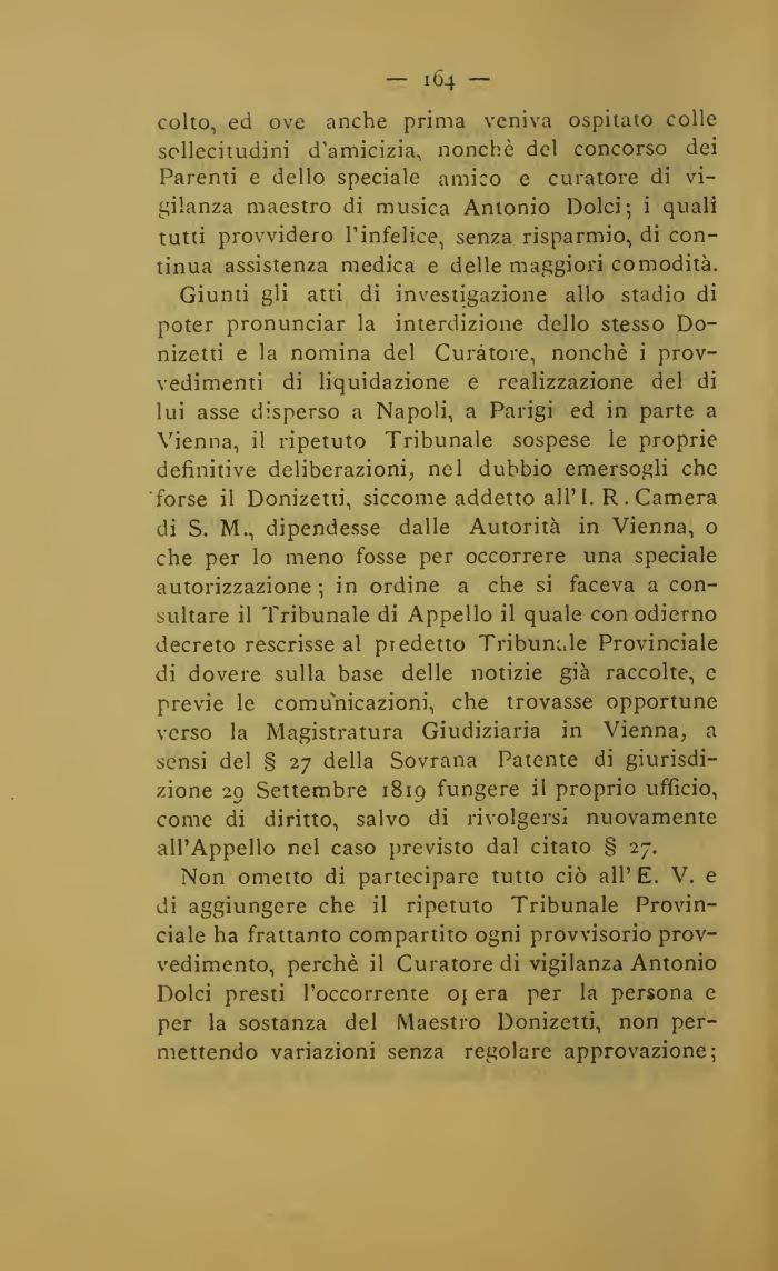 Non ometto di partecipare tutto ciò all' E. V. e di aggiungere che il ripetuto Tribunale Provinciale ha frattanto compartito ogni provvisorio provvedimento, perchè il Curatore di vigilanza Antonio Dolci presti l'occorrente oj era per la persona e per la sostanza del Maestro Donizetti, non permettendo variazioni senza regolare approvazione;
