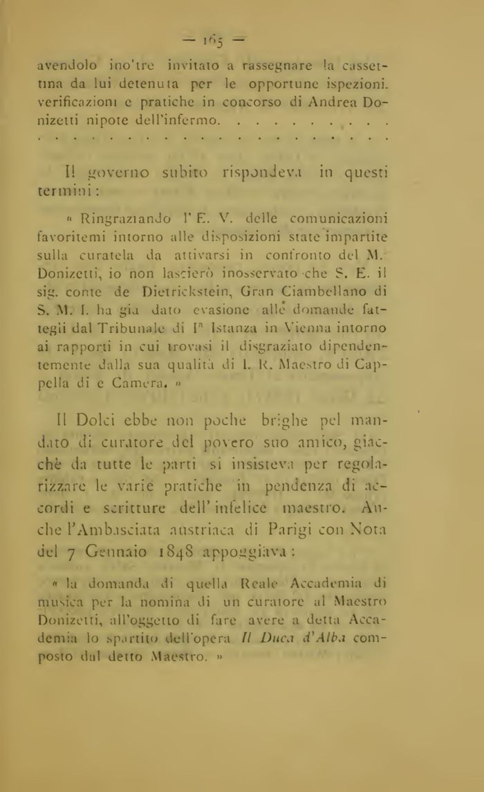 « Ringraziando 1' E. V. delle comunicazioni favoritemi intorno alle disposizioni state impartite sulla curatela da attivarsi in confronto del M. Donizetti, io non lascierò inosservato che ?. E. il sig. conte de Dietricksteirr, Gran Ciambellano di S. M. I. ha già dato evasione alle domande fattegli dal Tribunale di T Istanza in Vienna intorno ai rapporti in cui trovasi il disgraziato dipendentemente dalla sua qualità di 1. K. Maestro di Cappella di e Camera. »