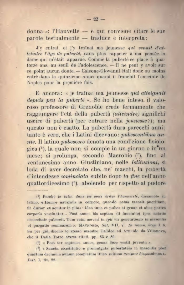 E ancora: « je trainai ma jeunesse qui atteignait depuis peti la puberté ». Se ho bene inteso, il valoroso professore di Grenoble crede fermamente che raggiungere l'età della pubertà (atteindre) significhi uscire di pubertà (per entrare nella jeunesse?); ma questo non è esatto. La pubertà dura parecchi anni ; tanto è vero, che i Latini dicevano : pubescentìbus an-nis. 11 latino pubescere denota una condizione fisiologica (*), la quale non si compie in un giorno o in'un mese; si prolunga, secondo Macrobio (2), fino al ventunesimo anno. Giustiniano, nelle Istituzioni, si loda di aver decretato che, ne' maschi, la pubertà s'intendesse cominciata subito dopo la fine dell'anno quattordicesimo (3), abolendo per rispetto al pudore