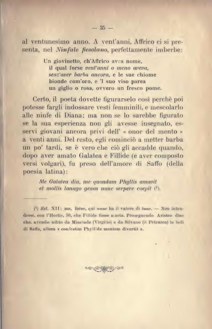 Certo, il poeta dovette figurarselo così perchè poi potesse fargli indossare vesti femminili, e mescolarlo alle ninfe di Diana; ma non se lo sarebbe figurato se la sua esperienza non gli avesse insegnato, esservi giovani ancora privi dell' « onor del mento » a venti anni. Del resto, egli cominciò a metter barba 1111 po' tardi, se è vero che ciò gli accadde quando, dopo aver amato Galatea e Fillide (e aver composto versi volgari), fu preso dell'amore di Saffo (della poesia latina):