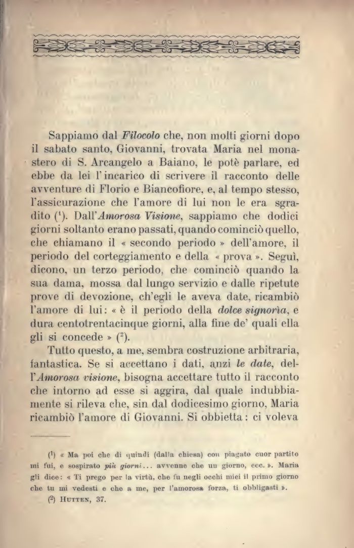 Sappiamo dal Filocolo che, non molti giorni dopo il sabato santo, Giovanni, trovata Maria nel monastero di S. Arcangelo a Baiano, le potè parlare, ed ebbe da lei l'incarico di scrivere il racconto delle avventure di Florio e Biancofiore, e, al tempo stesso, l'assicurazione che l'amore di lui non le era sgradito ('). Ball 'Amorosa Visione, sappiamo che dodici giorni soltanto erano passati, quando cominciò quello, che chiamano il « secondo periodo » dell'amore, il periodo del corteggiamento e della « prova ». Seguì, dicono, un terzo periodo, che cominciò quando la sua dama, mossa dal lungo servizio e dalle ripetute prove di devozione, ch'egli le aveva date, ricambiò l'amore di lui: « è il periodo della dolce signorìa, e dura centotrentacinque giorni, alla line de' quali ella gli si concede » (-). ![]() |