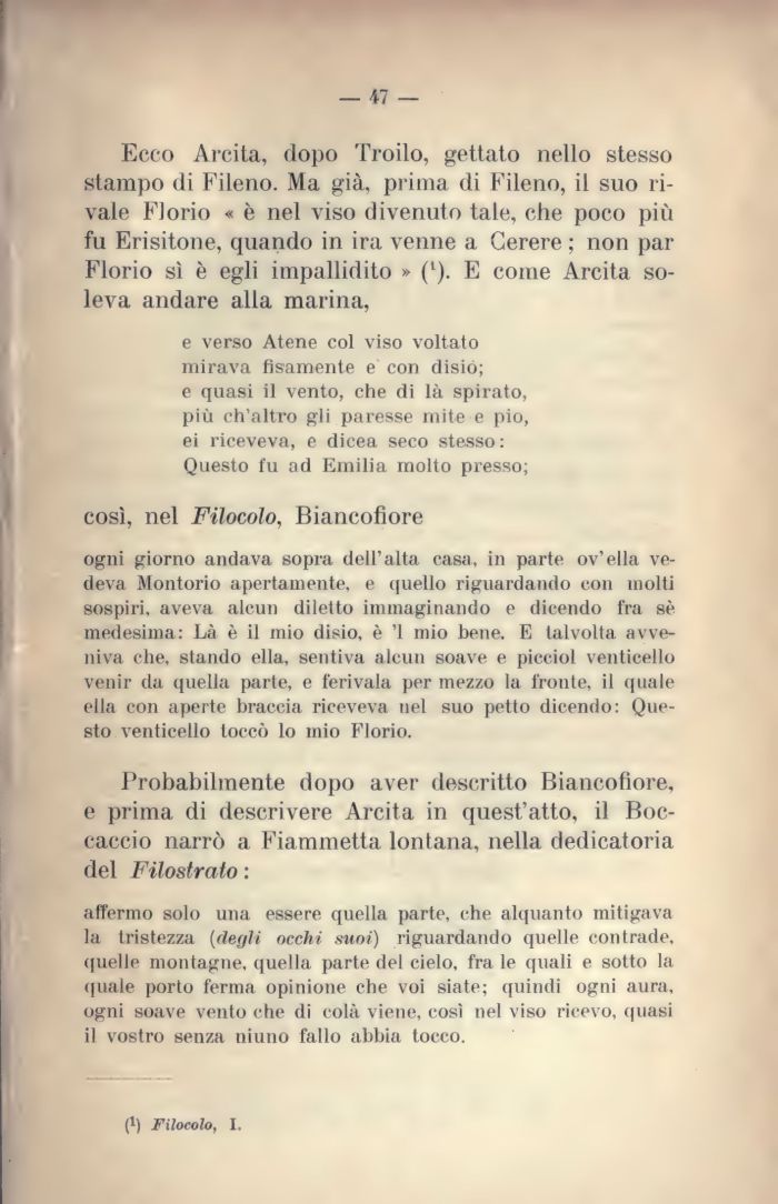 Ecco Arcita, dopo Troilo, gettato nello stesso stampo di Fileno. Ma già, prima di Fileno, il suo rivale Florio « è nel viso divenuto tale, che poco più fu Erisitone, quando in ira venne a Cerere ; non par Florio sì è egli impallidito » ('). E come Arcita soleva andare alla marina,