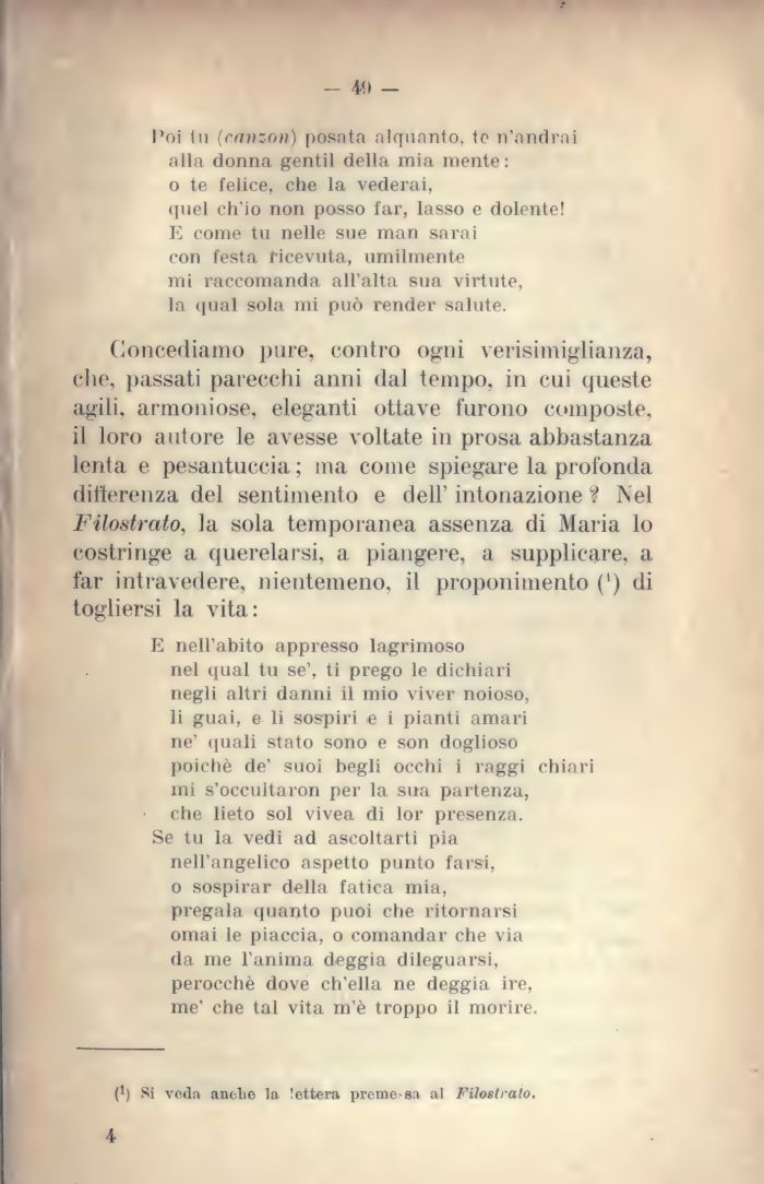 Concediamo pure, contro ogni verisimiglianza, clie, passati parecchi anni dal tempo, in cui queste agili, armoniose, eleganti ottave furono composte, il loro autore le avesse voltate in prosa abbastanza lenta e pesantuccia ; ma come spiegare la profonda differenza del sentimento e dell' intonazione ? Nel Filostrato, la sola temporanea assenza di Maria lo costringe a querelarsi, a piangere, a supplicare, a far intravedere, nientemeno, il proponimento (') di togliersi la vita: