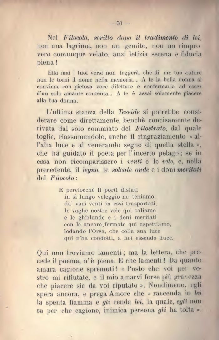 L'ultima stanza della Teseide si potrebbe considerare come direttamente, benché concisamente derivata dal solo commiato del Filostrato, dal quale toglie, riassumendolo, anche il ringraziamento « all'alta luce e al venerando segno di quella stella », che ha guidato il poeta per l'incerto pelago; se in essa non ricomparissero i venti e le vele, e, nella precedente, il legno, le solcate onde e i doni meritati del Filocolo :