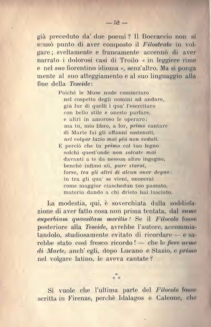La modestia, qui, è soverchiata dalla soddisfazione di aver fatto cosa non prima tentata, dal suine superbiam quaesitam meritis ! Se il Filocolo fosse posteriore alla Teseide, avrebbe l'autore, accommiatandolo, studiosamente evitato di ricordare — e sarebbe stato così fresco ricordo!— che le fiere arme di Marte, anch' egli, dopo Lucano e Stazio, e primo
