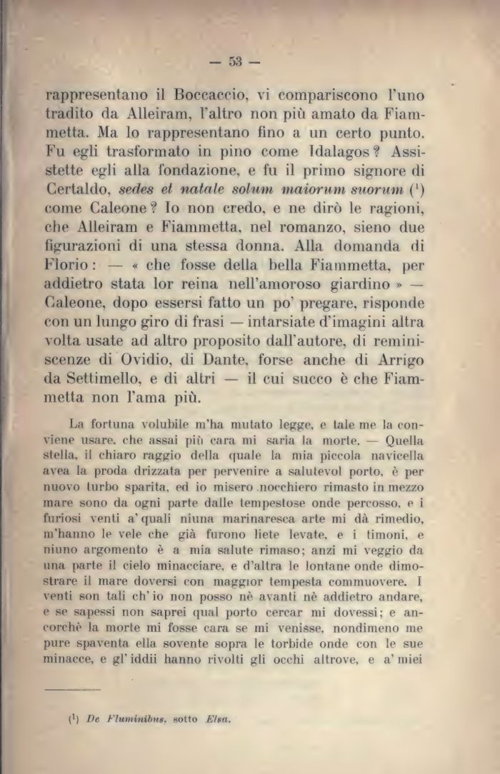 rappresentano il Boccaccio, vi compariscono l'uno tradito da Alleiram, l'altro non più amato da Fiammetta. Ma lo rappresentano fino a un certo punto. Fu egli trasformato in pino come Idalagos? Assistette egli alla fondazione, e fu il primo signore di Certaldo, sedes et natale solum maiorum suorum (') come Caleone ? Io non credo, e ne dirò le ragioni, che Alleiram e Fiammetta, nel romanzo, sieno due figurazioni di una stessa donna. Alla domanda di Florio : — « che fosse della bella Fiammetta, per addietro stata lor reina nell'amoroso giardino » — Caleone, dopo essersi fatto un po' pregare, risponde con un lungo giro di frasi — intarsiate d'imagini altra volta usate ad altro proposito dall'autore, di reminiscenze di Ovidio, di Dante, forse anche di Arrigo da Settimello, e di altri — il cui succo è che Fiammetta non l'ama più.