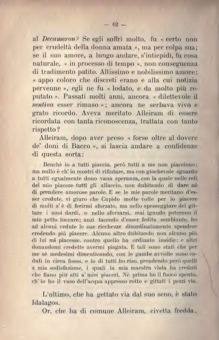 al Decameron? Se egli soffrì molto, fu « certo non per crudeltà della donna amata », ma per colpa sua; se il suo amore, a lungo andare, s'intiepidì, fu cosa naturale, « in processo di tempo », non conseguenza di tradimento patito. Altissimo e nobilissimo amore; « appo coloro che discreti erano e alla cui notizia pervenne », egli ne fu « lodato, e da molto più reputato ». Passati molti anni, ancora « dilettevole il sentiva esser rimaso » ; ancora ne serbava vivo e grato ricordo. Aveva meritato Alleiram di essere ricordata con tanta riconoscenza, trattata con tanto rispetto ?