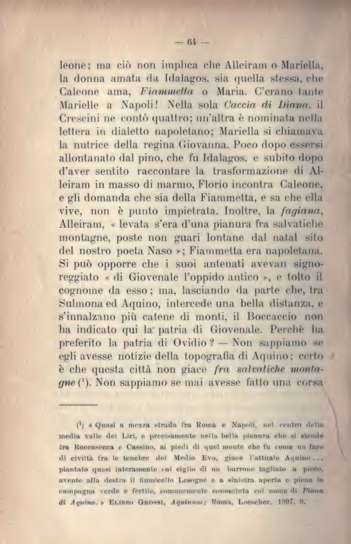 leone; ma ciò non implica che Alleiram o Mariella, la donna amata da Idalagos. sia (juella stessa, elio Galeone ama, Fiammetta o Maria. C'erano tante Marielle a Napoli! Nella sola Caccia di Diana, il Crescini ne contò quattro; un'altra è nominata nella lettera in dialetto napoletano; Mariella si chiamava la nutrice della regina Giovanna. Poco dopo essersi allontanato dal pino, che fu Idalagos. e subito dopo d'aver sentito raccontare la trasformazione di Alleiram in masso di marmo, Florio incontra Galeone, e gli domanda che sia della Fiammetta, e sa che ella vive, non è punto impietrata. Inoltre, la fagiana, Alleiram, « levata s'era d'una pianura fra sab atiche montagne, poste non guari lontane dal natal sito del nostro poeta Naso »; Fiammetta era napoletana. Si può opporre che i suoi antenati avevan signoreggiato « di Giovenale l'oppido antico », e tolto il cognome da esso ; ma, lasciando da parte che, tra Sulmona ed Aquino, intercede una bella distanza, e s'innalzano più catene di monti, il Boccaccio non ha indicato qui la patria di Giovenale. Perchè ha preferito la patria di Ovidio? — Non sappiamo se egli avesse notizie della topografia di Aquino; certo è che questa città non giace fra salvatiche montagne ('). Non sappiamo se mai avesse fatto una corsa