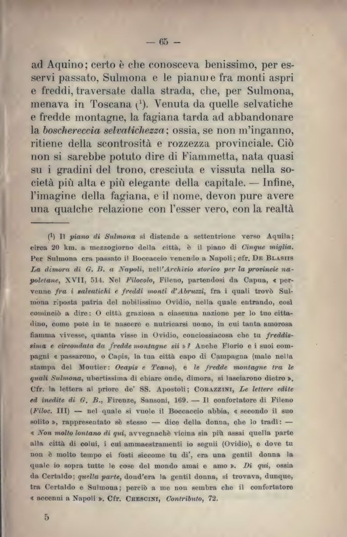 (*) Il piano di Sulmona si distende a settentrione verso Aquila; circa 20 km. a mezzogiorno della città, è il piano di Cinque miglia. Per Sulmona era passato il Boccaccio venendo a Napoli ; cfr. De Blasiis La dimora di 6. B. a Napoli, nell'Archivio storico per la Provincie napoletane, XVII, 514. Nel Filocolo, Fileno, partendosi da Capua, « pervenne fra i salvatichi e freddi monti d'Abruzzi, fra i quali trovò Sulmona riposta patria del nobilissimo Ovidio, nella quale entrando, così cominciò a dire: O cittì graziosa a ciascuna nazione per lo tuo cittadino, come potè in te nascere e nutricarsi uomo, in cui tanta amorosa fiamma vivesse, quanta visse in Ovidio, conciossiacosa che tu freddissima e circondata da fredde montagne sii » 1 Anche Florio e i suoi compagni « passarono, o Capis, la tua città capo di Campagna (male nella stampa del Moutier : Ocapis e Teano), e le fredde montagne tra le quali Sulmona, uhertissima di chiare onde, dimora, si lasciarono dietro ». Cfr. la lettera al priore de' SS. Apostoli; Corazzici, Le lettere edite ed inedite di G. B., Firenze, Sansoni, 169. — Il confortatore di Fileno (Filoc. III) — nel quale si vuole il Boccaccio abbia, « secondo il suo solito », rappresentato sè stesso — dice della donna, che lo tradì : — « Non molto lontano di qui, avvegnaché vicina sia più assai quella parte alla città di colui, i cui ammaestramenti io seguii (Ovidio), e dove tu non è molto tempo ci fosti sicoome tu di', era una gentil donna la quale io sopra tutte le cose del mondo amai e amo ». Di qui, ossia da Certaldo; quella parte, dond'era la gentil donna, si trovava, dunque, tra Certaldo e Sulmona; perciò a me non sembra che il confortatore « accenni a Napoli ». Cfr. CRBaciKr, Contributo, T2.
