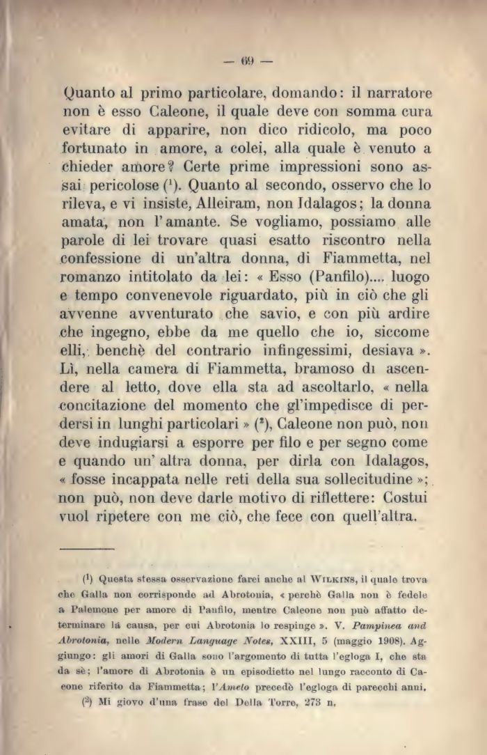 (•) Questa stessa osservazione farei anelie al AVilkins, il quale trova che Galla non corrispondo ad Abrotonia, < perchè Galla non è fedele a I'alemoue per amore di Panfilo, mentre Caleone non può affatto determinare la causa, per cui Abrotonia lo respinge ». V. Pampinea and. Abrotonia, nelle Modem Language Notes, XXIII, 5 (maggio 1908). Aggiungo: gli amori di Galla sono l'argomento di tutta l'egloga I, che sta da sè ; l'amore di Abrotonia è un episodietto nel lungo racconto di Cacone riferito da Fiammetta ; \'Amelo precedò l'egloga di parecchi anni, (a) Mi giovo d'una frase del Della Torre, 273 n,