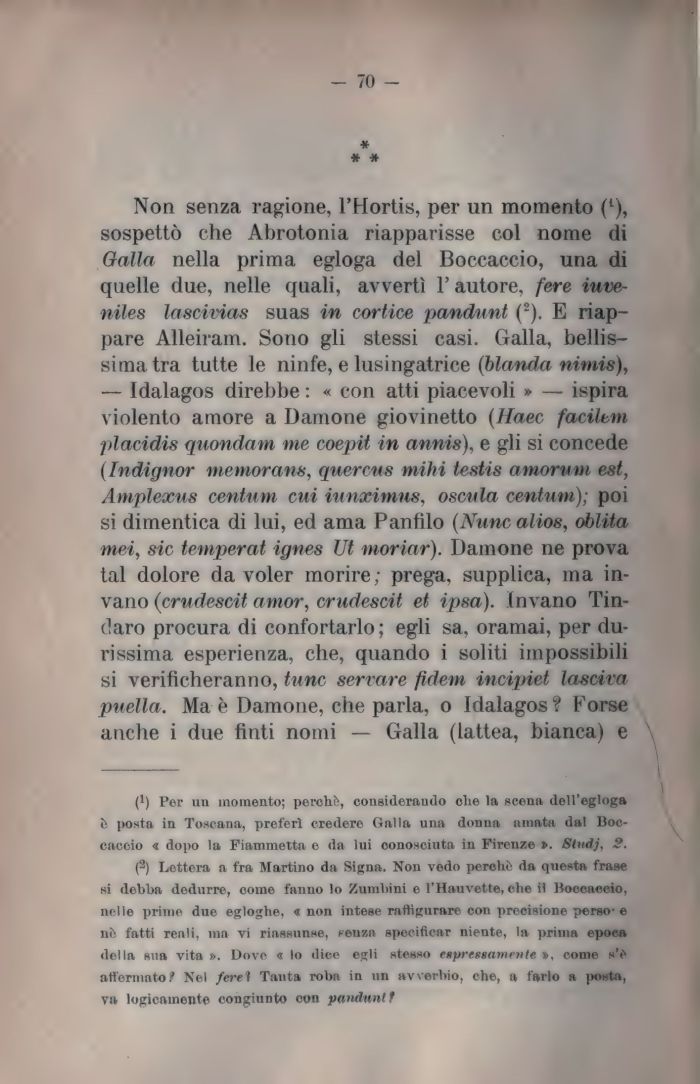 Non senza ragione, l'Hortis, per un momento (l), sospettò che Abrotonia riapparisse col nome di Galla nella prima egloga del Boccaccio, una di quelle due, nelle quali, avvertì l'autore, fere iuve-niles lascivias suas in cortice pandunt (2). E riappare Alleiram. Sono gli stessi casi. Galla, bellissima tra tutte le ninfe, e lusingatrice (blanda nimis), — Idalagos direbbe : « con atti piacevoli » — ispira violento amore a Damone giovinetto ( Haec facilem placidis quondam me coepit in annis), e gli si concede (Indignor memorans, querc-us mihi testis a morti m est, Amplexus centrini cui iunximns, oscula centum); poi si dimentica di lui, ed ama Panfilo (Nunc alios, oblita mei, sic temperat ignes Ut moriar). Damone ne prova tal dolore da voler morire; prega, supplica, ma invano (crudescit amor, crudescit et ipsa). Invano Tin-daro procura di confortarlo; egli sa, oramai, per durissima esperienza, che, quando i soliti impossibili si verificheranno, tunc servare fidem incipiet lasciva puella. Ma è Damone, che parla, o Idalagos ? Forse anche i due finti nomi — Galla (lattea, bianca) e