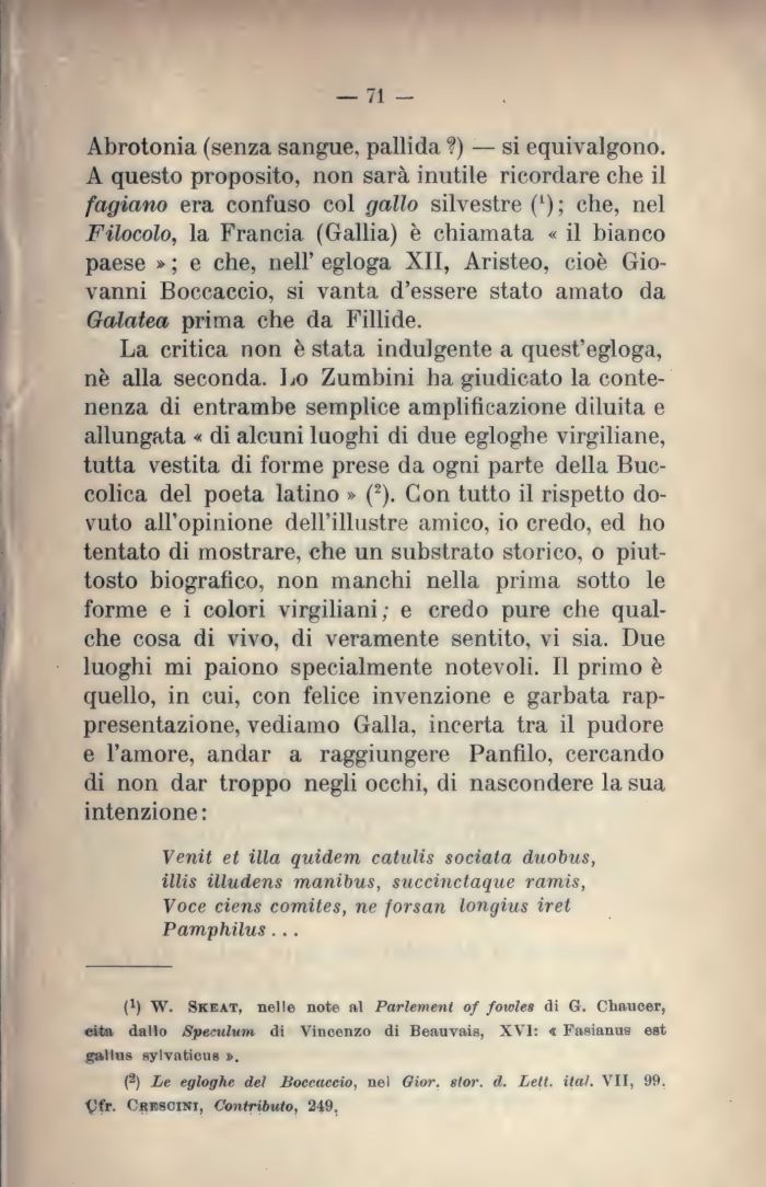 Abrotonia (senza sangue, pallida ?) — si equivalgono. A questo proposito, non sarŕ inutile ricordare che il fagiano era confuso col gallo silvestre (l) ; che, nel Filocolo, la Francia (Gallia) č chiamata « il bianco paese » ; e che, neil' egloga XII, Aristeo, cioč Giovanni Boccaccio, si vanta d'essere stato amato da Galatea prima che da Fillide.