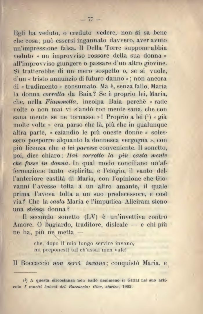 Egli ha veduto, o creduto vedere, non si sa bene che cosa; può essersi ingannato davvero, aver avuto un'impressione falsa. Il Della Torre suppone abbia veduto « un improvviso rossore della sua donna » all'improvviso giungere o passare d'un altro giovine. Si tratterebbe di un mero sospetto o, se si vuole, d'un « tristo annunzio di futuro danno » ; non ancora di « tradimento » consumato. Ma è, senza fallo, Maria la donna corrotta da Baia? Se è proprio lei, Maria, che, nella Fiammetta, incolpa Baia perchè « rade volte o non mai vi s'andò con mente sana, che con sana mente se ne tornasse » ! Proprio a lei (') « già molte volte » era parso che là, più che in qualunque altra parte, « eziandio le più oneste donne » solessero posporre alquanto la donnesca vergogna », con più licenza che a lei paresse conveniente. 11 sonetto, poi, dice chiaro : Hai corrotto la più casta mente che fosse in donna. In qual modo conciliano un'affermazione tanto esplicita, e l'elogio, il vanto dell'anteriore castità di Maria, con l'opinione che Giovanni l'avesse tolta a un altro amante, il quale prima l'aveva tolta a un suo predecessore, e così via? Glie la casta Maria e l'impudica Alleiram sieno una stessa donna? ![]() |