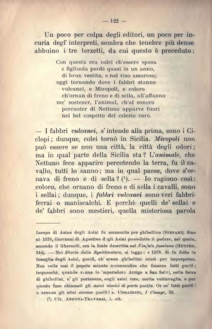 — I fabbri vulcanei, s'intende alla prima, sono i Ciclopi; dunque, colei tornò in Sicilia. Miropoli non può essere se non una città, la città degli odori ; ma in qual parte della Sicilia stai L'animale, che Nettuno fece apparire percotendo la terra, fu il cavallo, tutti lo sanno ; ma in qual paese, dove s'ornava di freno e di sella ? (1). — lo ragiono così : coloro, che ornano di freno e di sella i cavalli, sono i sellai ; dunque, i fabbri vulcanei sono veri fabbri-ferrai o maniscalchi. E perchè quelli de' sellai e de' fabbri sono mestieri, quella misteriosa parola