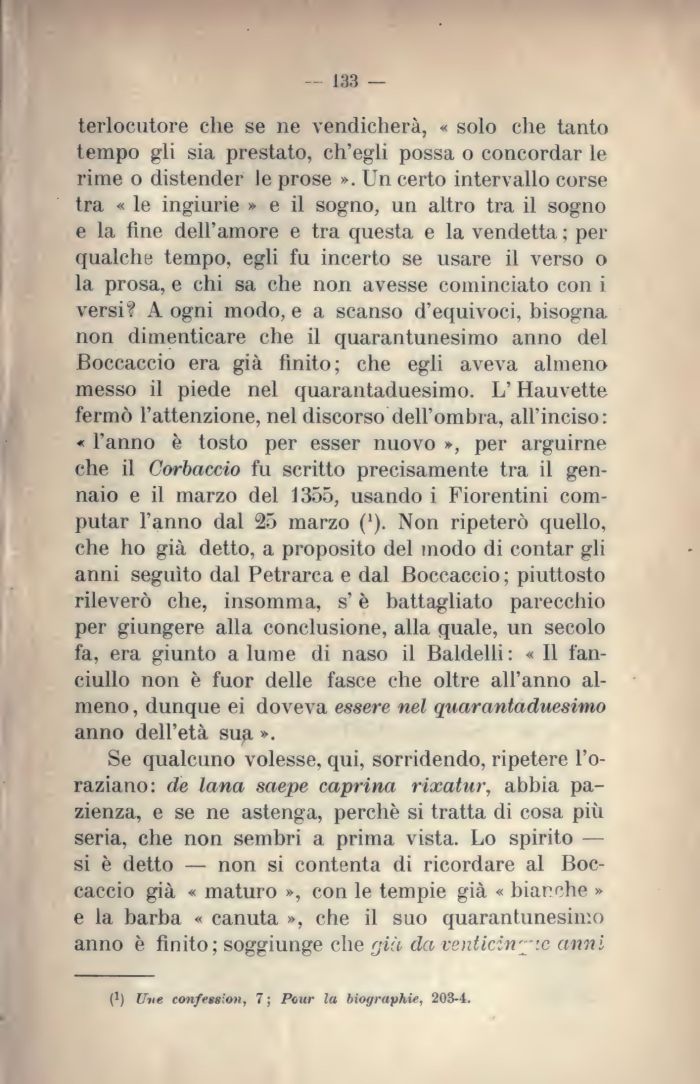 Se qualcuno volesse, qui, sorridendo, ripetere l'oraziano: de lana saepe caprina rixatur, abbia pazienza, e se ne astenga, perchè si tratta di cosa più seria, che non sembri a prima vista. Lo spirito — si è detto — non si contenta di ricordare al Boccaccio già « maturo », con le tempie già « bianche » e la barba « canuta », che il suo quarantunesimo anno è finito; soggiunge che già da venticin-^ic anni