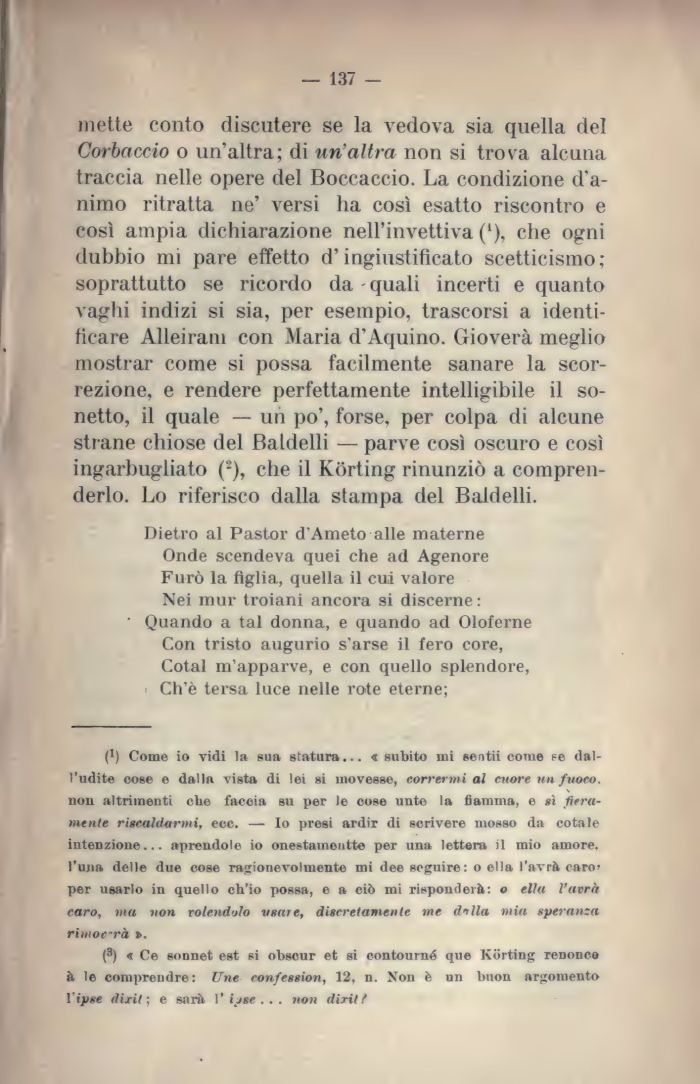 mette conto discutere se la vedova sia quella del Corbaccio o un'altra; di uri altra non si trova alcuna traccia nelle opere del Boccaccio. La condizione d'animo ritratta ne' versi ha così esatto riscontro e così ampia dichiarazione nell'invettiva ('), che ogni dubbio mi pare effetto d'ingiustificato scetticismo; soprattutto se ricordo da quali incerti e quanto vaghi indizi si sia, per esempio, trascorsi a identificare Alleiram con Maria d'Aquino. Gioverà meglio mostrar come si possa facilmente sanare la scorrezione, e rendere perfettamente intelligibile il sonetto, il quale — un po', forse, per colpa di alcune strane chiose del Baldelli — parve così oscuro e così ingarbugliato (2), che il Kòrting rinunziò a comprenderlo. Lo riferisco dalla stampa del Baldelli.