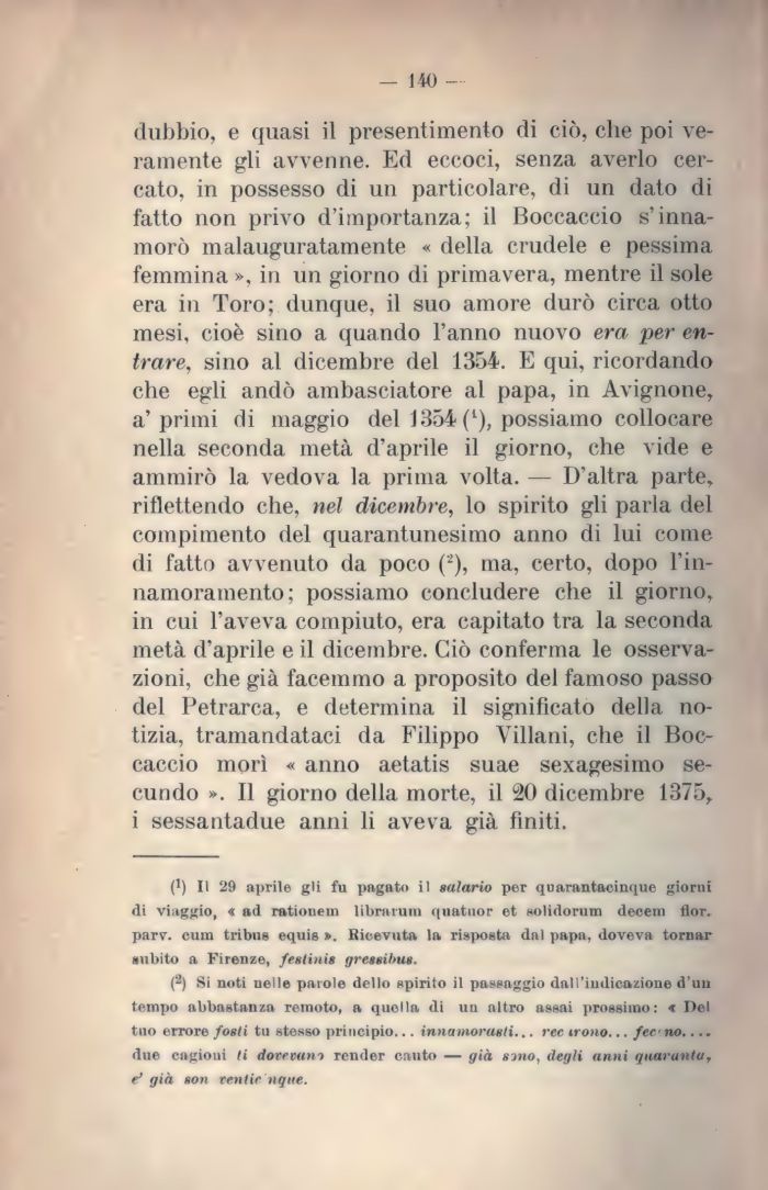 dubbio, e quasi il presentimento di ciò, che poi veramente gli avvenne. Ed eccoci, senza averlo cercato, in possesso di un particolare, di un dato di fatto non privo d'importanza; il Boccaccio s'innamorò malauguratamente « della crudele e pessima femmina », in un giorno di primavera, mentre il sole era in Toro; dunque, il suo amore durò circa otto mesi, cioè sino a quando l'anno nuovo era per entrare, sino al dicembre del 1354. E qui, ricordando che egli andò ambasciatore al papa, in Avignone, a'primi di maggio del 1354 (l), possiamo collocare nella seconda metà d'aprile il giorno, che vide e ammirò la vedova la prima volta. — D'altra parte, riflettendo che, nel dicembre, lo spirito gli parla del compimento del quarantunesimo anno di lui come di fatto avvenuto da poco (2), ma, certo, dopo l'innamoramento; possiamo concludere che il giorno, in cui l'aveva compiuto, era capitato tra la seconda metà d'aprile e il dicembre. Ciò conferma le osservazioni, che già facemmo a proposito del famoso passo del Petrarca, e determina il significato della notizia, tramandataci da Filippo Villani, che il Boccaccio morì « anno aetatis suae sexagesimo se-cundo ». Il giorno della morte, il 20 dicembre 1375, i sessantadue anni li aveva già finiti.