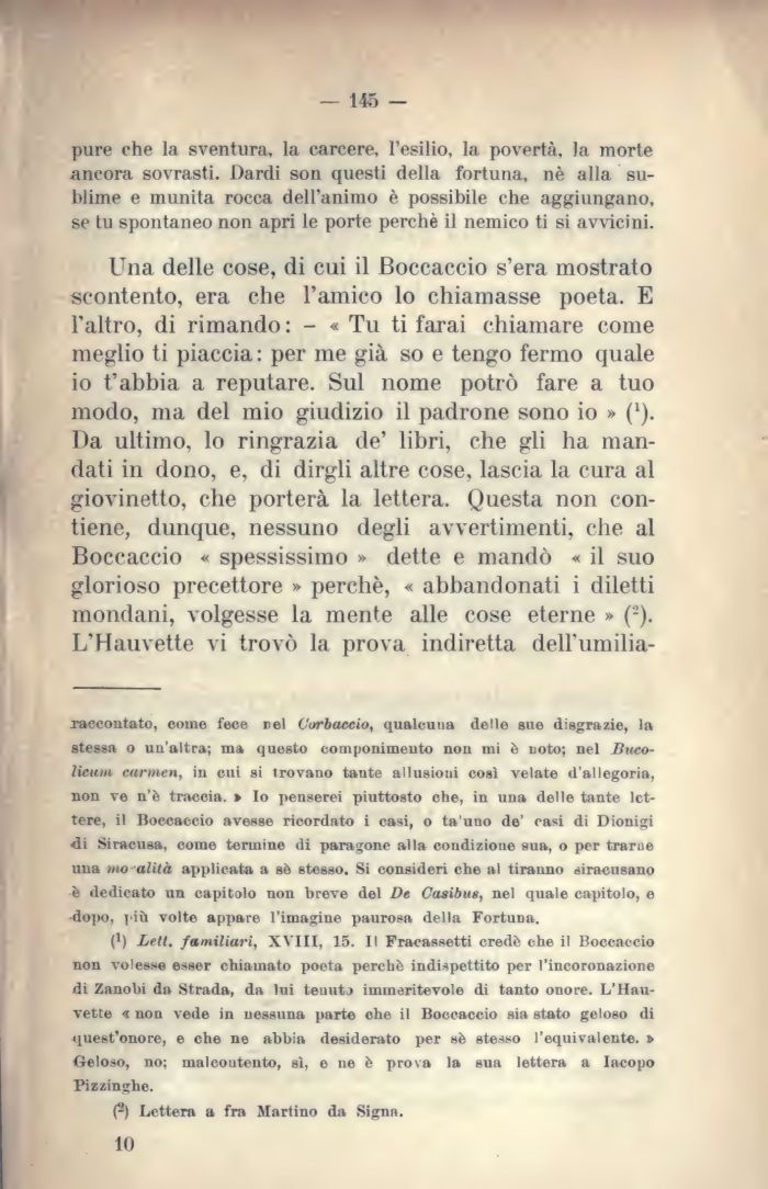 Una delle cose, di cui il Boccaccio s'era mostrato scontento, era che l'amico lo chiamasse poeta. E l'altro, di rimando : - « Tu ti farai chiamare come meglio ti piaccia : per me già so e tengo fermo quale io t'abbia a reputare. Sul nome potrò fare a tuo modo, ma del mio giudizio il padrone sono io » ('). Da ultimo, lo ringrazia de' libri, che gli ha mandati in dono, e, di dirgli altre cose, lascia la cura al giovinetto, che porterà la lettera. Questa non contiene, dunque, nessuno degli avvertimenti, che al Boccaccio « spessissimo » dette e mandò « il suo glorioso precettore » perchè, « abbandonati i diletti mondani, volgesse la mente alle cose eterne » (2). L'Hauvette vi trovò la prova indiretta dell'umilia-