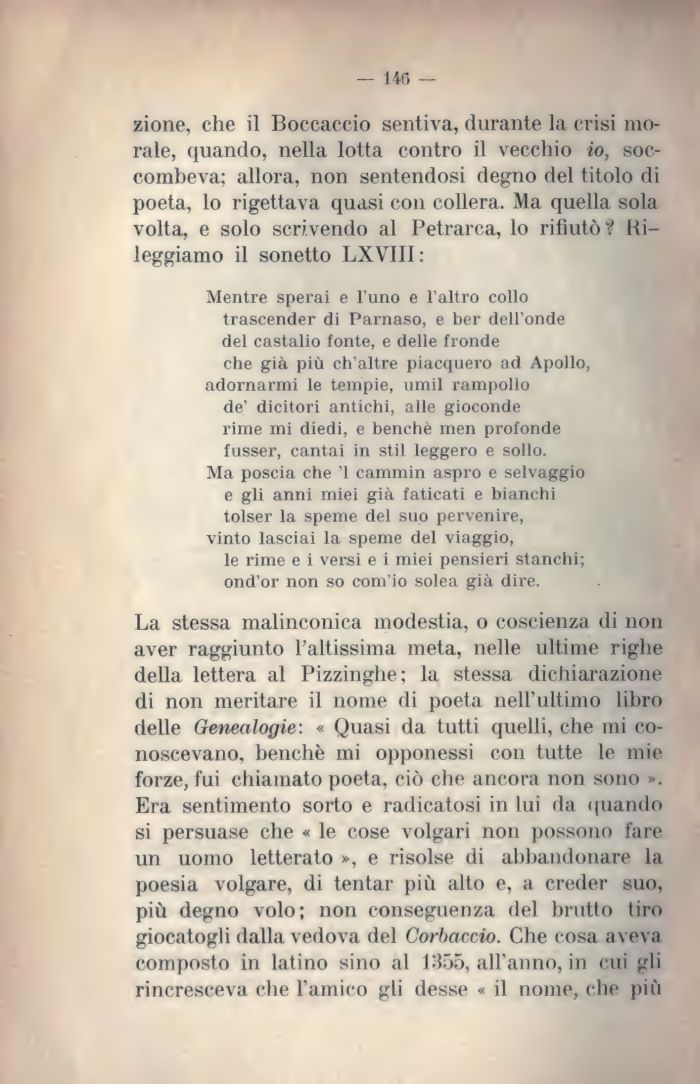zione, che il Boccaccio sentiva, durante la crisi morale, quando, nella lotta contro il vecchio io, soccombeva; allora, non sentendosi degno del titolo di poeta, lo rigettava quasi con collera. Ma quella sola volta, e solo scrivendo al Petrarca, lo rifiutò? Rileggiamo il sonetto LXVIII: