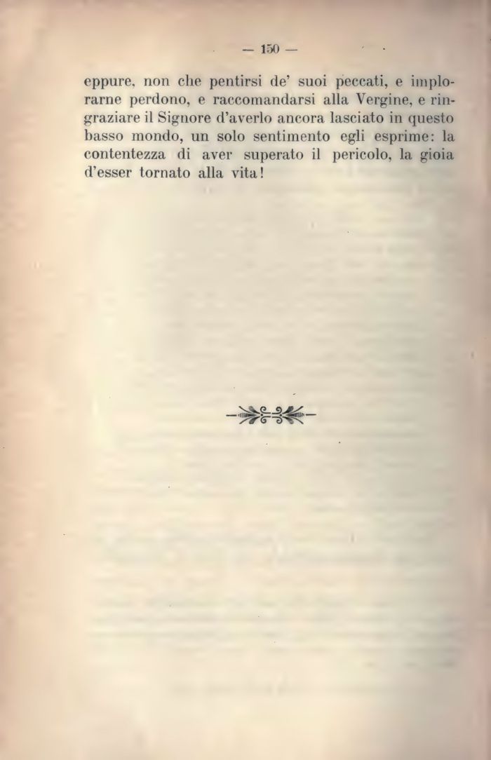oppure, non che pentirsi de' suoi peccati, e implorarne perdono, e raccomandarsi alla Vergine, e ringraziare il Signore d'averlo ancora lasciato in questo basso mondo, un solo sentimento egli esprime: la contentezza di aver superato il pericolo, la gioia d'esser tornato alla vita! ![]() |