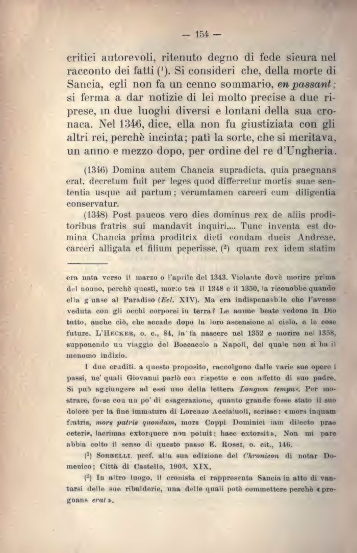 critici autorevoli, ritenuto degno di fede sicura nel racconto dei fatti ('). Si consideri che, della morte di Sancia, egli non fa un cenno sommario, enpassant: si ferma a dar notizie di lei molto precise a due riprese, in due luoghi diversi e lontani della sua cronaca. Nel 1346, dice, ella non fu giustiziata con gli altri rei, perchè incinta; patì la sorte, che si meritava, un anno e mezzo dopo, per ordine del re d'Ungheria.