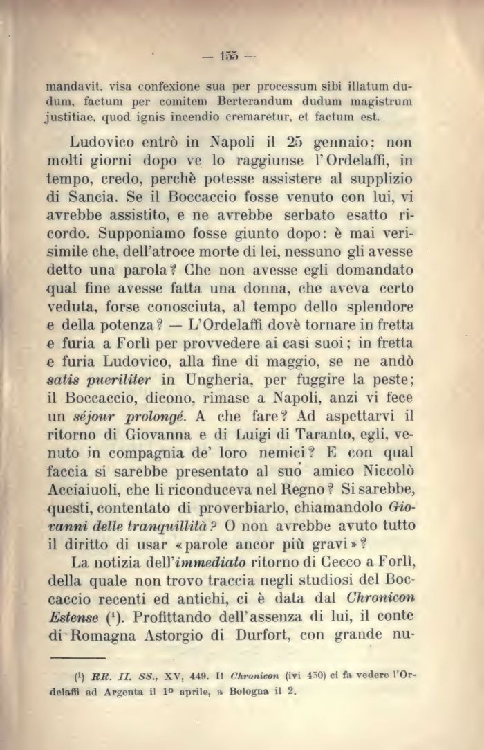 Ludovico entrò in Napoli il 25 gennaio; non molti giorni dopo ve lo raggiunse l'Ordelaffi, in tempo, credo, perchè potesse assistere al supplizio di Sancia. Se il Boccaccio fosse venuto con lui, vi avrebbe assistito, e ne avrebbe serbato esatto ricordo. Supponiamo fosse giunto dopo: è mai verisimile che, dell'atroce morte di lei, nessuno gli avesse detto una parola? Che non avesse egli domandato qual fine avesse fatta una donna, che aveva certo veduta, forse conosciuta, al tempo dello splendore e della potenza? — L'Ordelaffi dovè tornare in fretta e furia a Forlì per provvedere ai casi suoi ; in fretta e furia Ludovico, alla fine di maggio, se ne andò satis pueriliter in Ungheria, per fuggire la peste; il Boccaccio, dicono, rimase a Napoli, anzi vi fece un séjotir prolongé. A che fare? Ad aspettarvi il ritorno di Giovanna e di Luigi di Taranto, egli, venuto in compagnia de' loro nemici ? E con qual faccia si sarebbe presentato al suo amico Niccolò Acciaiuoli, che li riconduceva nel Regno? Si sarebbe, questi, contentato di proverbiarlo, chiamandolo Giovanni delle tranquillità ? 0 non avrebbe avuto tutto il diritto di usar « parole ancor più gravi » ?