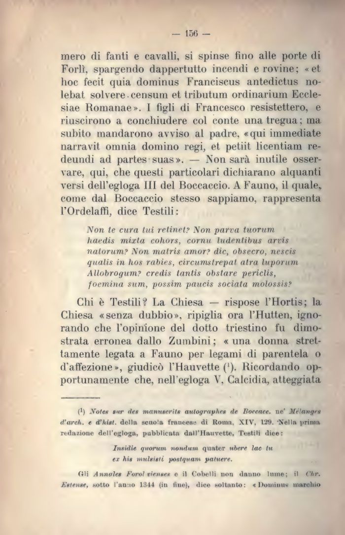 mero di fanti e cavalli, si spinse fino alle porte di Forlì, spargendo dappertutto incendi e rovine; «et hoc fecit quia dominus Franciscus antedictus no-lebat sol vere, censum et tributum ordinari um Eccle-siae Romanae». I figli di Francesco resistettero, e riuscirono a conchiudere col conte una tregua; ma subito mandarono avviso al padre, «qui immediate narravit omnia domino regi, et petiit licentiam re-deundi ad partes-suas». — Non sarà inutile osservare, qui, che questi particolari dichiarano alquanti versi dell'egloga III del Boccaccio. A Fauno, il quale, come dal Boccaccio stesso sappiamo, rappresenta l'Ordelaffi, dice Testili: